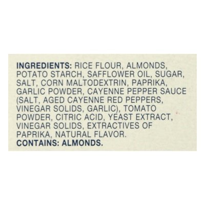 Made with real almonds. Rice cracker snacks with almonds. 17 crackers per serving. Certified gluten free. gfco.org. No wheat or gluten. No trans fat. New look same great taste! Get a big kick out of spicy sriracha flavored. Handfuls of fantastic, flavorful crunching you can feel good about. We love our almonds so much we baked them into crispy crackers with irresistible flavors. Dig in, dip them, pass them around. It's the ultimate snack with the one and only nutty crunch. Crunch on!! This package is sold by weight, not by volume. www.bluediamond.com. Questions or comments? Write Blue Diamond customer support, PO Box 1768, Sacramento, CA 95812 or call 1 (800) 987-2329. Please include code number found on top of carton with all inquiries. Try all of our irresistible snack crackers! Multi-seeds. Original. Hint of sea salt. Hint of sea salt.
