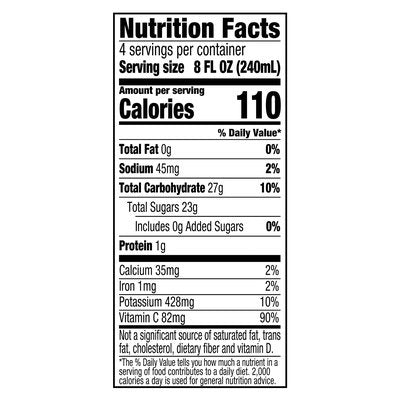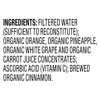 An organic orange, pineapple, white grape and carrot juice blend from concentrates with other ingredients. 110 calories per 8 fl oz. Each 8 fl oz cup provides 3/4 cup serving of fruit (serving information based on USDA's MyPlate (ChooseMyPlate.gov)). USDA Organic. Certified Organic by Quality Assurance International. No added sugar. Not a low calorie food. See nutrition information for calorie and sugar content. Non-GMO Project verified. nongmoproject.org. Pasteurized for your safety. Made with the finest ingredients. Natural separation may occur. It was 1961 in Paradise, California. A place where the pursuit of craft and quality was taking root among farmers, friends and wellness-minded folks. That's where our story begins, when a harvest of grapes from vineyards in California inspired R.W. Knudsen to begin bottling his own fruit juice. It was the first batch of many-all crafted with an unprecedented commitment to integrity and quality. Purposely crafted and packed with delicious ingredients-these juice blends were made to boost your day with abundant goodness. The way we've always made them. - The Knudson Family. rwknudsenfamily.com. Glass recycles.