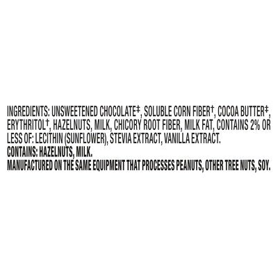 Chocolate with 40% cocoa. 150 calories per 11 pieces. 3 g Net Carbs per Serving: 14 g total carbohydrate - 7 g fiber - 4 g erythritol = 3 g net carbs per serving. Certified gluten free. gfco.org See nutrition information for total fat and saturated fat content. No sugar added. lilys.com. SmartLabel: Scan here or call 1-800-468-1714 for more food information. Fair Trade certified.