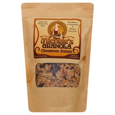 Made with whole grain oats. No additives or preservatives. Wheat & dairy free. Handmade in small batches. Michele's Cinnamon Raisin Granola was inspired by one of Michele's all-time favorite treats - the classic oatmeal raisin cookie. Packed with wholesome walnuts, sweet Thompson raisins, and a swirl of cinnamon, every bag of our uniquely crunchy granola is handmade in small bathes, baked slowly to golden brown perfection, and hand packaged with love. We hope you enjoy it as much as we enjoyed baking it for you! www.michelesgranola.com. 1%: Give 1 for good food. Certified vegan. vegan.org. No GMOs. Baked with wind power.