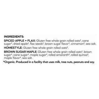 Gluten free instant oatmeal. Spiced Apple + Flax: 4 g fiber (per serving). Homestyle: 4 g fiber (per serving). Brown Sugar Maple: 3 g fiber (per serving). Spiced Apple + Flax: Whole Grain. 28 g or more per serving. Eat 48 g or more of whole grains daily. WholeGrainsCouncil.org. 28 g whole grains (per serving). USDA Organic. Certified Organic by QAI. Vegan Homestyle: 100% Whole Grain: 40 g or more per serving. 100% of the grain is whole grain. WholeGrainsCouncil.org. 40 g whole grains (per serving). USDA Organic. Certified Organic by QAI. Vegan. Brown Sugar Maple: Whole Grain: 31 g or more per serving. Eat 48 g or more of whole grains daily. WholeGrainsCouncil.org. 31 g whole grains (per serving). USDA Organic. Certified Organic by QAI. Vegan. Good source of fiber. Spiced Apple + Flax: Non-GMO Project verified. nongmoproject.org. Homestyle: Non-GMO Project verified. nongmoproject.org. Brown Sugar Maple: Non-GMO Project verified. nongmoproject.org. Our Organic Promise: The Certified Organic seal on this package guarantees these ingredients have been grown in harmony with nature, reducing exposure to toxic synthetic chemicals and genetically modified seeds. It's been a promise from our family to yours for over 30 years. Our Gluten Free Promise: Our delicious blend with wholesome rolled oats will show you just how good gluten free can be! All conventions are very enjoyable. The more variety you do, the better. - Jeremy Bulloch. Quality Guarantee: Not feeling the love? If you've less than thrilled with this product, please let us know. Just send the UPC and the best before code to: Consumer Services c/o Nature's Path Foods, 275-250 H St., Blaine WA, 98230 USA or contact us at: www.naturespath.com/contact-us and we'll make things right. how2recycle.info. www.naturespath.com. Let's stay connected! Facebook. Instagram. TikTok. Twitter. Pinterest. Spiced Apple + Flax: FSC. Homestyle: FSC. Brown Sugar Maple: FSC.