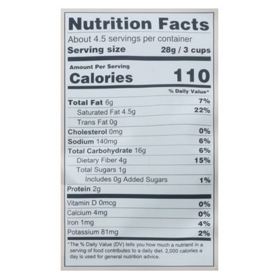 With organic coconut oil. Certified gluten-free. gfco.org. Vegan. USDA Organic. Certified Organic by Baystate Organic Certifiers. Good source of fiber. 40% less fat (Typical oil-popped popcorn contains 10 g fat, 3 g fiber, and 150 calories per serving). 33% more fiber (Typical oil-popped popcorn contains 10 g fat, 3 g fiber, and 150 calories per serving). 27% fewer calories (Typical oil-popped popcorn contains 10 g fat, 3 g fiber, and 150 calories per serving). Non-GMO Project verified. nongmoproject.org. Simple acts. Clean snacks. Premium quality, minimally processed. 100% air popped. Making healthier, less processed, earth-friendly snacking accessible to everyone. We air pop the most tender organic butterfly popcorn, making it noticeably lighter and fluffier than other pre-packaged popcorn. Our popcorn is tumbled in the best oils and sprinkled with the finest salts available. The Mindful Moment Manifesto: We live in a world full of distractions. We can't change that, but we can all find ways to slow down and savor the little moments. It's the small things in life, like sharing smiles, laughter, or even snacks, that make us happiest. At LesserEvil, we believe that just a few simple acts can contribute to something great. By sourcing organic ingredients, using better fats, and practicing sustainability, we're able to make the cleanest (and tastiest) snacks in the world. It's our small way of making the world a little less evil. We are scrappy - Danbury, Connecticut kind of scrappy. We make it happen at our snack factory where we own every ingredient, recipe, and process. It's an East Coast kind of Zen. When wellness guides your spirit, you are your own guru. lesserevil.com. NEOPlastics.com. Connect with the Guru: Facebook; Instagram; Twitter. Chat with the guru! Email: talk2us(at)lesserevil.com. Made with Neo packaging energy. Neo plastics can increase biogas production at municipal landfills, supporting biogas clean energy programs. Visit NEOPlastics.com. Please discard in the trash. Do not recycle.