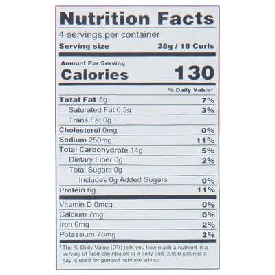 6 g protein per serving. Gluten free. Certified Organic by Baystate Organic Certifiers. Certified Paleo. Grain Free. Lab-tested nograin.org. Non-GMO Project verified. nongmoproject.org. Simple acts. Clean snacks. Protein from egg whites. This product has a PDCAAS value of 1. Making healthier, less processed, earth-friendly snacking accessible to everyone. Clean protein and good fat make for an efficient energy source for your body. These crunchy Power Curls use humanely raised, cage-free egg white powder and avocado oil to provide 5 g fat and 6 g protein per serving. You can feel good about taking these for a dip (or double dip)! Simple Acts, Clean Snacks: We live in a world full of distractions. We can't change that, but we can all find ways to slow down and savor the little moments. It's the small things in life, like sharing stories, smiles, laughter, or even snacks, that make us happiest. At LesserEvil, we believe that just a few simple acts can make a big difference. By sourcing organic ingredients, using better oils, and practicing sustainability, we're able to make cleaner, tastier, and more environmentally friendly snacks. Focusing on what we can do to be a better company is our small way of contributing to a better world. We are scrappy - Danbury, Connecticut kind of scrappy. We make it happen at our snack factory where we own every ingredient, recipe, and process. It's an East Coast kind of Zen. When wellness guides your spirit, you are your own Guru. lesserevil.com. Connect with the Guru: Facebook. Instagram. Twitter. Chat with the guru! Email: talk2us(at)lesserevil.com. Made with Neo plastics packaging to energy. Neo plastics can increase biogas production at municipal landfills, supporting biogas clean energy programs. Visit neoplastics.com. Humanely raised cage-free eggs. Please discard in the trash do not recycle.