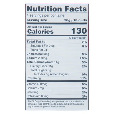 6 g protein per serving. Gluten free. Certified Organic by Baystate Organic Certifiers. Certified Paleo. Grain Free. Lab-tested nograin.org. Non-GMO Project verified. nongmoproject.org. Simple acts. Clean snacks. Protein from egg whites. This product has a PDCAAS value of 1. Making healthier, less processed, earth-friendly snacking accessible to everyone. Clean protein and good fat make for an efficient energy source for your body. These crunchy Power Curls use humanely raised, cage-free egg white powder and avocado oil to provide 6 g fat and 6 g protein per serving. You can feel good about taking these for a dip (or double dip)! Simple Acts, Clean Snacks: We live in a world full of distractions. We can't change that, but we can all find ways to slow down and savor the little moments. It's the small things in life, like sharing stories, smiles, laughter, or even snacks, that make us happiest. At LessErevil, we believe that just a few simple acts can make a big difference. By sourcing organic ingredients, using better oils, and practicing sustainability, we're able to make cleaner, tastier, and more environmentally friendly snacks. Focusing on what we can do to be a better company is our small way of contributing to a better world. We are scrappy - Danbury, connecticut kind of scrappy. We make it happen at our snack factory where we own every ingredient, recipe, and process. It's an East Coast kind of Zen. When wellness guides your spirit, you are your own Guru. lesserevil.com. Connect with the Guru: Facebook. Instagram. Twitter. lesserevil.com. Chat with the guru! Email: talk2us(at)lesserevil.com. Made with Neo plastics packaging to energy. Neo plastics can increase biogas production at municipal landfills, supporting biogas clean energy programs. Visit neoplastics.com. Humanely raised cage-free eggs. Please discard in the trash do not recycle.