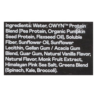 100% plant based. 100% plant powered. Vanilla with other natural flavors. 32 g plant protein. 0 g sugar (Not a low calorie food). 0 g net carbs. 100% gluten free. 100% vegan. Allergy friendly: No dairy, soy, peanuts, tree nuts, wheat/gluten. Only What You Need: All 9 essential amino acids. Zero sugar. Keto friendly. Nothing You Don't: Dairy, wheat/gluten, soy, egg, peanuts, nuts, fish, shellfish, chemicals, fillers, artificial colors, flavors or sweeteners. No dairy, soy, wheat/gluten. Non-GMO Project verified. nongmoproject.org. Non-GMO. Only what you need. What's inside matters. Free from the top 8 allergens. Tested for top 8 allergens. OWYN's finished products are independently tested for detection of the top 8 allergens every lot, every time. liveowyn.com. Instagram. Facebook. liveowyn.com. (at)liveowyn. Questions, comments, or more info visit liveowyn.com. Peas from North America.