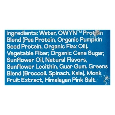 Smooth vanilla with other natural flavors. 3 net carbs per serving. Certified Vegan. vegan.org. Certified Gluten-Free. Low sugar content. Non GMO Project verified. nongmoproject.org. Only What You Need. We milk plants not cows. What's inside matters. Greens blend. Nothing You Don't: dairy, wheat/gluten, soy; egg, peanuts, nuts, fish, shellfish, chemicals, fillers, artificial junk, sugar alcohols. Free from the top 8 allergens. The plant-based revolution. Tested for top 8 allergens. OWYN's ingredients and finished products are independently tested for detection of the top 8 allergens every lot, every time. This is a snack. 500 mg Omega 3s. Good source of fiber. Essential amino acids. liveowyn.com. nongmoproject.org. vegan.org. Instagram. Facebook. (at)liveowyn. Questions, comments, or more info visit liveowyn.com. Fare: Food Allergy Research & Education. National strategic partner.