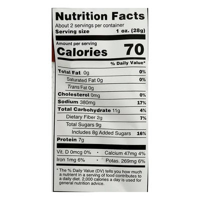 Samurai inspired flavor in bento sized bites. 15 grams protein. 15 g protein. Per Serving: 70 calories; 0 g total fat (0% DV); 0 g sat fat (0% DV); 380 mg sodium (17% DV); 7 g protein; 9 g sugar. Gluten free. Vegan. Non GMO certified by NSF. Non-GMO. No preservatives. Bold. Tender. Carefully marinated & handcrafted the best tasting jerky on earth guaranteed. Dig in! Tasty Teriyaki: Perky Jerky has done it again - creating a plant-based jerky that's in a league of its own! With its authentic jerky texture and bold flavor, you'd never know this tasty snack is meatless! Take this protein fueled snack with you on any adventure. Tasty Teriyaki plant-based jerky is non-GMO and uses traditional ingredients like tamari-based soy sauce, pineapple juice, and ginger to create amazing flavor. So what are you waiting for? Natural Born Rule Benders: Our quest is to create the boldest, most flavorful snack for like-minded adventure-seekers. And because no one is more tender than those that give back, we donate a percentage of our proceeds to Duchenne Muscular Dystrophy and Down Syndrome - causes near and dear to our hearts. Made with: improved nature. The best tasting Jerky on earth. Guaranteed. Certified plant based. www.perkyjerky.com. (ay)perkyjerky. Facebook; Twitter; Instagram. Bold. Tender. Curious? www.perkyjerky.com. TenderGuard. Windowless packaging ensures maximum freshness.