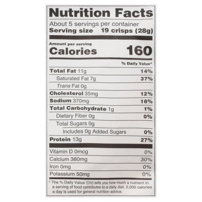 0 g sugar. 1 g carbs per serving. 13 g protein per serving. See nutrition information for fat, saturated fat, cholesterol & sodium content. 100% cheese snack. ParmCrisps branded snacks are artisan-crafted, crunchy crisps made of 100% aged parmesan cheese and premium seasonings. Oven-baked in small batches, ParmCrisps have no artificial growth hormones (No significant difference has been found in milk from cows treated with artificial hormones), flavors, colors or preservatives. Pair with your favorite bottle of wine, enjoy on a salad, soup or straight out of the bag. Sophisticated snacking at its finest. parmcrisps.com. (at)parmcrisps. Facebook. Twitter. Instagram. Made in the USA.