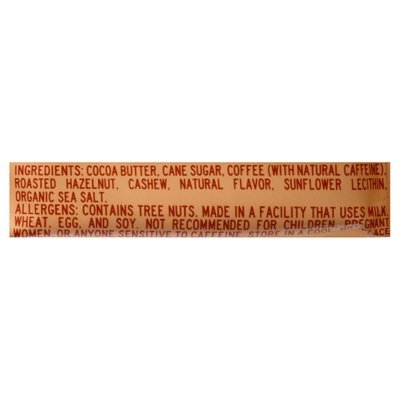 Coffee bar - caffeinated with real coffee. Gluten-free. Soy-free. Vegan 100-120 mg natural caffeine. Not made with genetic modification. Ready-to-eat coffee. This square = one coffee. No artificial sweeteners, flavors, preservatives, caffeine or colors. Sweetness: 3. Caffeine: 3. www.pocketlatte.com. Instagram (at)pocketlatte. Proudly made in the USA.