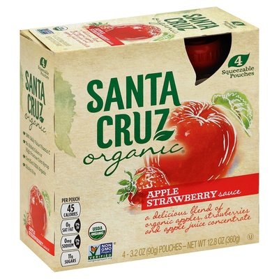 Squeezable pouches. A delicious blend of organic apples, strawberries and apple juice concentrate. Per Pouch: 45 calories; 0 g sat fat (0% DV); 0 mg sodium (0% DV); 11 g sugars. USDA organic. Non GMO Project verified. nongmoproject.org. The Art of Organics: We love nature, and believe it's the truest form of art. We have been pioneers of the organic movement since the early 1970s. It's who we are. It's what we do. And more importantly, it's what we love. Beautifully Green: We are committed to being sustainable, responsible and keeping our planet remarkable. We are a Greene certified company, recycling more than 95% of our waste and buying enough renewable energy credits each year to cover our production needs - it's a beautiful thing. Live organic. Live Santa Cruz. Try all varieties of Santa Cruz Organic Apple Sauce. Visit santacruzorganic.com for details! Gluten free. Certified renewable energy. Green-e: We match 100% of our electricity use with certified renewable energy. 100% daily value vitamin C. No added colors or high fructose corn syrup. Certified USDA organic. santacruzorganic.com. Certified organic by Quality Assurance International.