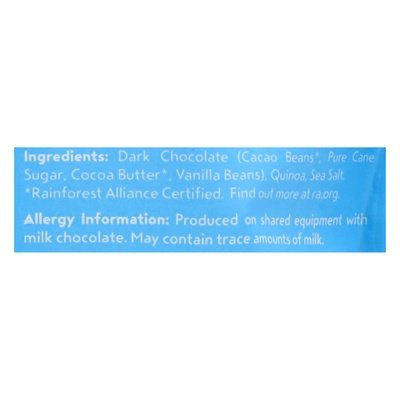 120 calories per serving. 6 g sugar per serving. Certified gluten free. gfco.org. Certified nut-free. Manufactured in a facility free from: Wheat, peanuts, tree nuts, eggs, fish, shellfish, sesame, and poppy seeds. Halal. Non-GMO Project verified. nongmoproject.org. Plant based. School safe. Discover the perfect snack! Simple ingredients. Mini crisps! Crispy quinoa. Lightly chocolate covered! Discover Undercover! An irresistibly satisfying. Incredibly delicious crazy-crunchy chocolate snack made from simple, better-for-you ingredients! Premium chocolate; crispy quinoa; sea salt. Enjoy! www.UndercoverSnacks.com. Scan me. Facebook: facebook.com/UndercoverSnacks. Twitter: twitter.com/UCSnacks. Instagram: (at)undercoversnacks. Women Owned. Rainforest Alliance certified. Made in the USA from U.S. and imported ingredients.