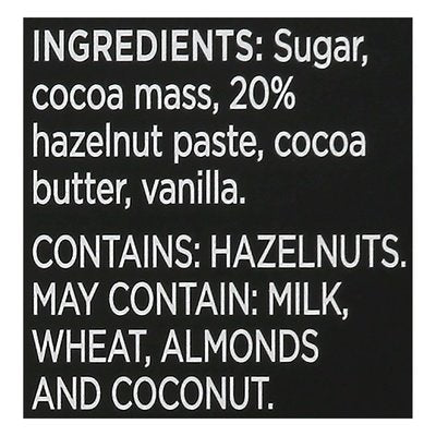 A smooth blend of hazelnut & deliciously rich dark chocolate. No artificial flavors. Vegan. Non GMO Project verified. nongmoproject.org. Empowering women. See back of panel. Owned by cocoa farmers. Adinkra symbols - find out their meanings inside. Seriously Good Chocolate: Fairtrade cocoa grown by family farmers in Ghana; natural ingredients; 100% pure cocoa butter. No palm oil or soy. Cocoa solids 41% minimum. divinechocolate.com. (hashtag)TasteDivine. Discover more at: divinechocolate.com. Divine has supported the empowerment of women cocoa farmers for over 20 years. Discover more: divinechocolate.com/divinewomen. Certified B Corporation. Fairtrade. Sugar, cocoa, vanilla: Traded in compliance with Fairtrade Standards, total 80% of the product's ingredients. Visit www.info.fairtrade.net. Product of Germany.