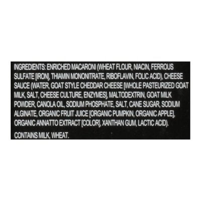 No artificial flavors. Per 1 Cup: 250 calories; 2 g sat fat (10% DV); 510 mg sodium (22% DV); 3 g total sugars. Goat goodness. Peace. Love. Goats. Creamy. Delicious. Handmade goat cheddar cheese. No artificial preservatives. No synthetic dyes. About Funny Farm. Welcome to the Funny Farm Family. We don't use traditional cow milk; our products are made exclusively with goat milk which is predominately A2 milk from happy frolicking goats. Goats are nature's perfect milk source due to the nutritional benefits and low carbon hoofprint. Ounce for ounce, goats deliver more milk per ounce of grass eaten than cows! Goat milk has more protein and is usually easier to digest than cow milk because the goat milk globule is up to 10 times smaller than that of a cow. Taste what we mean when we say better milk makes better cheese. Our milk & cheese are free of antibiotics and growth hormones. Tasting Notes: Creamy Yellow Cheddar with a delicious clean finish and no goaty aftertastes. Cheese blend coats and covers the macaroni perfectly! Look for our other delicious Funny Farm goat cheese products including our cheese popcorns, fresh cheeses and our goat milk ice cream. funnyfarmfoods.com. For more info go to: funnyfarmfoods.com. Carton made from 100% recycled fibers. Minimum 35% post-consumer content. 100% of our cheese is produced and packaged in the USA.