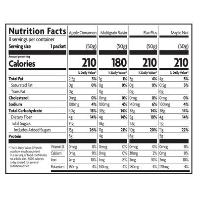 Apple Cinnamon: 4 g fiber. Multigrain Raisin: 4 g fiber. Flax Plus: 5 g fiber. Maple Nut: 4 g fiber. Apple Cinnamon/Multigrain Raisin/Flax Plus/Maple Nut: USDA Organic. Look for whole grains. Apple Cinnamon: Whole Grain: 35 g or more per serving. Eat 48 g or more per serving. WholeGrainsCouncil.org. 35 g whole grains (per serving). Multigrain Raisin: Whole Grain: 28 g or more per serving. Eat 48 g or more per serving. WholeGrainsCouncil.org. 28 g whole grains (per serving). Flax Plus: Whole Grain: 37 g or more per serving. Eat 48 g or more per serving. WholeGrainsCouncil.org. 37 g whole grains (per serving). Maple Nut: Whole Grain: 37 g or more per serving. Eat 48 g or more per serving. WholeGrainsCouncil.org. 37 g whole grains (per serving). Certified Organic: Quality Assurance International. Good source of fiber. Apple Cinnamon/Multigrain Raisin/Flax Plus /Maple Nut: Non-GMO Project verified. nongmoproject.org. Non-GMO: No genetic engineering has been used at any stage in growing the ingredients or in making this oatmeal. At Natures Path, we’re committed to feeding you only organic, non-GMO ingredients. It’s the better choice for our bodies and for the planet. Always organic. Crafted with care. We've carefully selected your favorite flavors to create this Variety Pack made with Certified Organic rolled oats, that we're sure you'll love! Our Organic Promise. The Certified Organic seal on this package guarantees these ingredients have been grown in harmony with nature, reducing exposure to toxic synthetic chemicals and genetically modified seeds. It's been a promise from our family to yours for over 30 years. Quality Guarantee. Not feeling the love? If you’re less than thrilled with this product, let us know. Just send the Best Before box on the side flap and the UPC to the right to: Consumer services c/o Nature’s path foods, No. 275-250 H St., Blaine WA, 98230 USA or contact us at: WWW.naturespath.com/contact-us and we’ll make things right. www.naturespath.com. Let’s stay connected! Facebook. Instagram. Tik Tok. Twitter. Pinterest. Apple Cinnamon/Multigrain Raisin/Flax Plus/Maple Nut: FSC. Product of USA