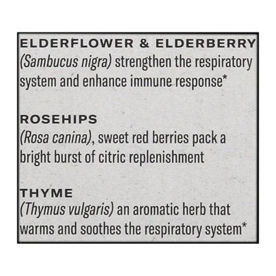 Herbal Supplement. Elderflower, elderberry, rosehips & thyme. Plant based tea wrappers. USDA Organic. Certified Organic by QAI. Caffeine free. No caffeine. Non-GMO Project verified. nongmoproject.org. Protect & support. Activating purpose. Protect & Support: Sweet & herbaceous power of elderberry, rosehips & thyme. All real ingredients. Ethically sourced. www.numitea.com. Instagram. Facebook. Twitter. Connect with us (hashtag)drinknumi. Making a Difference: We are a sister and brother who believe in taking care of our global family and this planet we live on. That's why we source the purest tea leaves, herbs and flowers straight from nature, no compromise. By choosing Numi, you've helped empower thousands of people through fair wages, access to education, and clean water. Together, we can create lasting positive impact for people and the planet for generations to come. Join our movement at numitea.com. Certified B Corporation. Eco Friendly Packaging: Through thoughtful choices, Numi Annually Conserves: 3,800,000 gallons water. 2,200 million BTUS energy conserved. 3,000 trees. 310,000 lbs. of landfill. Impact states from papercalculator.org. Printed with soy ink. Fair trade certified ingredient. Protective envelope made from renewable, non-GMO eucalyptus and sugarcane. Please recycle! Climate Neutral Certified. (These statements have not been evaluated by the Food and Drug Administration. This product is not intended to diagnose, treat, cure, or prevent any disease)