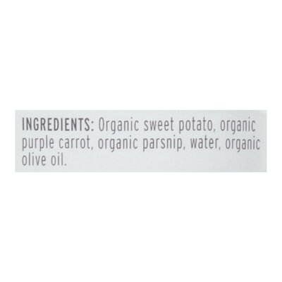 6+ months. Organic sweet potato & parsnip with purple carrot & olive oil. 5 g fat. USDA Organic. Certified organic by Oregon Tilth. Non GMO Project verified. nongmoproject.org. No sugary fruits. Serenity Kids because every bite counts. Veggies & fats. Babies need veggies and 30 g of fat per day to help grow their bodies and brains.