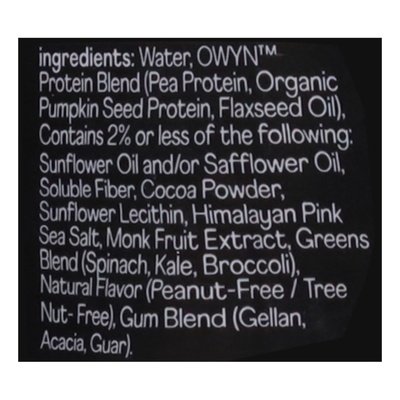 32 g plant protein. 0 g sugar. 0 g net carbs per serving. 100% Gluten free. 100% Vegan. No dairy, soy. wheat/gluten. No sesame, peanut, tree nuts. Not a low calorie food. All 9 essential amino acids. Excellent source omega-3 ALA. Contains 3 g prebiotics. Keto friendly. Nothing You Don't: Dairy, wheat/gluten, soy, egg, peanuts, nuts, sesame, fish, shellfish, chemicals, filters, artificial colors, flavors or sweeteners. Non-GMO Project verified. nongmoproject.org. 100% plant powered. Only What You Need. 100% plant based. Natural variation may occur. Peas from North America. Tested for top 9 allergens. OWYN's finished products are independently tested for detection of the top 9 allergens every lot, every time. What's inside matters. liveowyn.com. Instagram. Facebook. (at)liveowyn. Questions, comments, or more info visit liveowyn.com. BPA free.