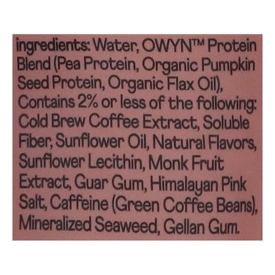 20 g protein. 160 calories; 180 mg caffeine. 0 g net carbs. Contains 3 g probiotics. 100% gluten free. 100% vegan. No dairy, soy, wheat/gluten. No sesame, peanuts, tree nuts. Excellent source omega-3. Good source of fiber. Essential amino acids. Allergy Friendly: No dairy, soy, peanut, tree nuts, sesame, wheat/gluten. Non-GMO Project verified. nongmoproject.org. Double shot. What's inside matters. Only What You Need: 100% plant based. Peas from North America. Noting yo don't. Tested for Top 9 Allergens: Owyn's finished products are independently tested for detection of the top 9 allergens every lot, every time. liveowyn.com. Instagram. (at)liveowyn. Questions, comments, or more info visit liveowyn.com.