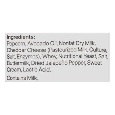 60 calories per cup. Certified gluten free. Whole grains. 15 g or more per serving. Eat 48 g or more of whole grains daily. WholeGrainCouncil.org. Whole Grain: 15 g serving per cup. Vegetarian friendly. Gourmet popcorn. Made with milk from cows not treated with rBST (The FDA claims that no significant difference has been shown between milk derived from rBST-treated and non-rBST-treated cows). Air popped. Popcorn is the canvas that we paint with bold flavors. Be bold. Be you. Be art. We are Pop Art Snacks and we know how beautifully unique you are. Your courage to stand out, inspires us at Pop Art to bring you delicious popcorn with bold and innovative flavors. Reminding all of us, that when you inspire greatness in yourself, you inspire greatness in others. Feed your fire! Ignite your soul and shine bright with this fiery combination of spicy jalapeno and creamy cheddar cheese popcorn. Burn baby! www.popartsnacks.com. Facebook: /popartsnacks. Instagram, Twitter: (at)popartsnacks. Pop with Purpose: Pop Art Snacks passion is to help today's youth realize their unbridled potential in life. This is why Pop Art supports children's charities that are focused on empowering children through art. For more information visit: www.popartsnacks.com/charities. Made in the USA with domestic and imported ingredients.