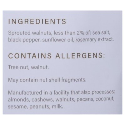 Walnuts seasoned with cracked black pepper & sea salt. Per 1 Oz Serving: 2 g fiber; 0 g added sugar; 4 g protein; 2 g net crabs. Gluten free. Vegan. Non-GMO Project verified. nongmoproject.org. Nature's sprouted super snack. Nutrient dense. Plant-based protein. Superfood. Black pepper & sea salt sprouted walnuts Cracked black pepper and natural sea salt harmonize with the soft woody flavors and firm crunch of sprouted walnuts. The Purely Sprouted Path to Super Snackness. Source premium, all-natural, non-gmo nuts and seeds. Soak in purified water to remove Nutrient-blockers, improving absorption and digestion. Awaken the bioavailable nutrients Inside through sprouting. Perfect with clean, dry air and fresh, natural flavors. Our purely sprouted pledge we're committed to conscious nutrition, transparent ingredients and a healthier planet. We promise to provide clean-label snacks with no artificial colors, No artificial sweeteners and no artificial preservatives. Clean label. PurelySprouted.com. Instagram. Facebook. Woman founded. 1% for the planet.