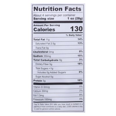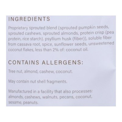 Almonds, cashews & pumpkin seeds seasoned with chili & black pepper. Per 1 Oz Serving: 0 g trans fat; 5 g fiber; 0 g added sugar; 5 g protein. Gluten free. Vegan. Non-GMO Project verified. nongmoproject.org. Nature's sprouted super snack. Nutrient dense. Superfood. Zippy black pepper and a touch of chili heat I a mouth-watering mix of sprouted nuts and seeds. The purely sprouted path to super snackness. Source premium, all-natural non-GMO nuts and seeds. Soak in purified water to remove nutrient-blockers, improving absorption and digestion. Awaken the bioavailable nutrients inside through sprouting. Perfect with clean, dry air and fresh, natural flavors. Our purely sprouted pledge. We're committed to conscious nutrition, transparent ingredients and a healthier planet. We promise to provide clean-label snacks with no artificial colors, no artificial sweeteners and no artificial preservatives. Clean label. PurelySprouted.com. Instagram; Facebook. Women founded. 1% for the planet.