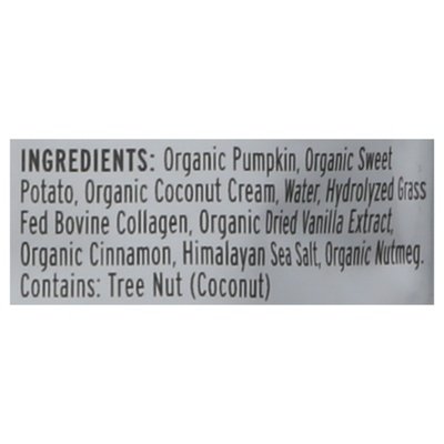 All ages. 6+ months. Pumpkin spice with organic coconut cream, sweet potato, cinnamon & nutmeg. 5 g protein. 5 g fat. Dairy-free. USDA Organic. Certified Organic by Oregon tilth. Serenity Kids. Grass fed + collagen. Serenity Kids because every bite counts. Collagen is the body's most abundant protein and plays an essential role in whole body function & growth. www.myserenitykids.com. Contact(at)myserenitykids.com. 512-537-8847. BPA-free package. Terracycle. Family owned & made in the USA.