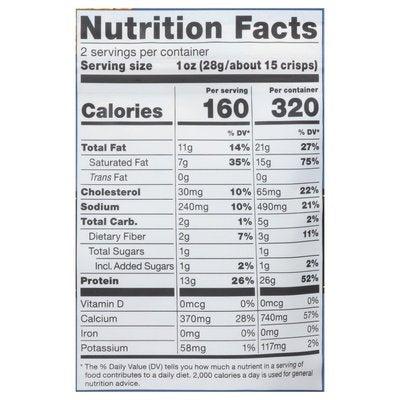 13 g protein per serving. Naturally lactose free (Naturally lactose free due to cheese aging process). Certified Gluten-free. See nutrition information for fat, saturated fat and sodium content. Since 1931. Craft baked. mozzarella cheese. Delicious. Crunchy. Craveable. Everything you love about pizza, made bite-size snackable. This bite-sized snack packs pizza's delicious flavor & fun into satisfying and crunchy little triangles. Our crisps are craft-baked with mozzarella and seasoned with tomato, basil, and garlic. rBST free (No significant difference has been shown between milk derived from rBST-treated and non rBST-treated cows). www.sonomacreamery.com. Facebook. Twitter. Instagram. Made in Sonoma, California Wine Country - since 1931.