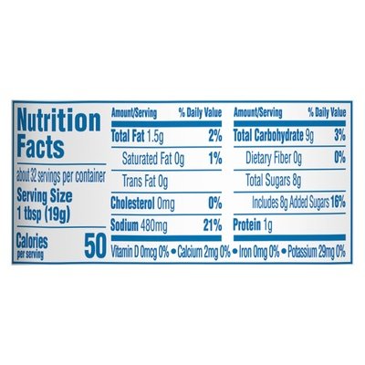 Per 1 tbsp Serving: 50 calories; 0 g sat fat (1% DV); 480 mg sodium (21% DV); 8 g total sugars. Simple, real ingredients & homemade taste. Marinates 30+ servings (1 tbsp marinade per 4 oz. uncooked protein). No preservatives. Hoisin sauce. Garlic. Soy Sauce. SoyVay.com. how2recycle.info. Questions or comments, call 800-444-6369. Recipe ideas at SoyVay.com.