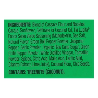 Certified gluten free. gfco.org. Vegan. Dairy free. Good source of fiber. Non-GMO Project verified. nongmoproject.org. Food is love! Crafted with care. Flavorful heat. Curler power! Superfood No pales cactus. Get rooted cassava flour. Good seed chia seeds. That's right amigo, a cactus chip! Nopales cactus is the secret ingredient to our tasty tortilla chips, also made with cassava root flour and chia seeds. Did we mention our cactus chips are grain free, a good source of fiber and will make you forget about those other tortilla chips? Now you know. - Tia Lupita. Everyone's favorite Tia! Tia Lupita Foods are inspired Mexican recipes from Hector's and her family kitchen (and curler!) Flavorful sauces and snacks. Healthy, sustainable ingredients. Food truly is love with every taste of Tia Lupita! Product sold by weight not by volume. Some settling may occur during shipping. For California residents only. tialupitafoods.com. Facebook. Twitter. Pinterest. Check out our hot sauces and cactus tortillas! tialupitafoods.com. Product of USA.
