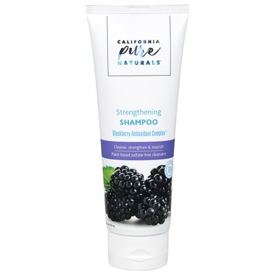 Cleanse, strenghten & nourish. Vegan. Gluten free. We never use GMOs. Plant-based sulfate-free cleansers. 70% organic ingredients. Strengthening shampoo. Say hello to great hair! Our Strengthening Shampoo utilizes sulfate-free, plant-based cleansers to gently remove impurities. Meanwhile, ginkgo biloba, chamomile and burdock root refresh and fortify hair and scalp for an invigorating experience. Your hair becomes manageable and full of shine! Blackberry Antioxidant Complex Organic Blackberry. Organic Kiwi. Organic Pomegranate. Organic Grape. California Pure Naturals utilizes the power of our exclusive Blackberry Antioxidant Complex, which captures and contains the benefits of antioxidants found in the ripe fruits grown in the verdant fields of California to fight the harmful effects of free-radicals. The result from these antioxidants is lustrous, more resilient and stronger hair. We never use: parabens, phthalates, GMOs, artificial dyes, artificial fragrances, petroleums or petrolatums, ethoxylates, dimethicones, sulfates. californiapurenaturals.com. Cruelty free. Made in CA.