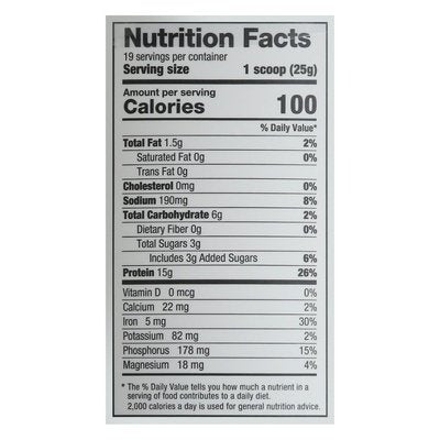 Per Serving: 15 g protein; 1.5 g fat; 6 g carbs; 3 g sugar; 100 calories; 3 g BCAA (Branched chain amino acids have been shown to support muscle protein synthesis, reduce muscle breakdown, provide muscle fuel and support recovery from exercise). 3 g branched chain amino acids (BCAAs) per serving. 2430 mg glutamine and precursors per serving. Lab Tested: Gluten & soy free. Vegan. Peas are a Vegetarian Superfood: Each serving of pea protein contains: 6.25x more iron than 1 cup of raw spinach; 4x more protein than 15 almonds; 2.5x more protein than 1 large egg (based on grams, not amino acid profile); almost 2x the protein of 1 cup dairy milk (based on grams, not amino acid profile). Feel the GN Pure Pea Difference: 3 g branched chain amino acids (BCAAs) per serving; 2430 mg glutamine and precursors per serving; 100% essential amino acids; excellent source of iron; smoother plant protein source that can make shakes creamier; free from top 8 allergens; 100% digestible protein. Non GMO Project verified. nongmoproject.org. Typical Amino Acid Profile of Pea Protein: Amino Acid: Alanine; % Total AA: 4.40%; Per Serving: 660 mg. Amino Acid: Arginine; % Total AA: 8.20%; Per Serving: 1230 mg. Amino Acid: Aspartic Acid; % Total AA: 11.90%; Per Serving: 1785 mg. Amino Acid: Cystine; % Total AA: 1.00%; Per Serving: 150 mg. Amino Acid: Glutamic Acid; % Total AA: 16.20%; Per Serving: 2430 mg. Amino Acid: Glycine; % Total AA: 4.10%; Per Serving: 615 mg. Amino Acid: Histidine (Essential Amino Acids your body does not produce on its own); % Total AA: 2.40%; Per Serving: 360 mg. Amino Acid: Isoleucine (Essential Amino Acids your body does not produce on its own) (Branched Chain Amino Acids (BCAA) used for fueling and regenerating muscle. All values are approximate); % Total AA: 5.00%; Per Serving: 750 mg. Amino Acid: Leucine (Essential Amino Acids your body does not produce on its own) (Branched Chain Amino Acids (BCAA) used for fueling and regenerating muscle. All values are approximate); % Total AA: 8.40%; Per Serving: 1260 mg. Amino Acid: Lysine; % Total AA: 7.60%; Per Serving: 1140 mg. Amino Acid: Methionine (Essential Amino Acids your body does not produce on its own); % Total AA: 1.20%; Per Serving: 180 mg. Amino Acid: Phenylalanine (Essential Amino Acids your body does not produce on its own); % Total AA: 5.70%; Per Serving: 855 mg. Amino Acid: Proline; % Total AA: 4.50%; Per Serving: 675 mg. Amino Acid: Serine; % Total AA: 5.20%; Per Serving: 780 mg. Amino Acid: Threonine (Essential Amino Acids your body does not produce on its own); % Total AA: 3.90%; Per Serving: 585 mg. Amino Acid: Trytophan (Essential Amino Acids your body does not produce on its own); % Total AA: 1.00%; Per Serving: 150 mg. Amino Acid: Tyrosine; % Total AA: 3.90%; Per Serving: 585 mg. Amino Acid: Valine (Essential Amino Acids your body does not produce on its own) (Branched Chain Amino Acids (BCAA) used for fueling and regenerating muscle. All values are approximate); % Total AA: 5.40%; Per Serving: 810 mg. Growing Naturals - Pure plant protein powders. Deliciously creamy. Nothing artificial. Your Pure Protein Source: Custom-Build your Personal Blend with Premium Rice Protein: Clinically tested for sport; new premium flavors; 100% all essential amino acids. Notice: This product is sold by weight not volume. Settling of blended powder up to 50% may occur while on its way to shelves near you. Flavor not derived from corn, soy or gluten. Contains split peas which are a lentil legume. GrowingNaturals.com. nongmoproject.org. Facebook. Pinterest. Instagram. YouTube (hashtag)PurePlantProtein; (at)growingnaturals. Best of Raw: Voted best protein powder. BPA free. Complete our earth-friendly process by recycling this bottle. From North American peas. Mfd. in the USA with domestic and imported ingredients.