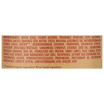 Intensive hydration conditioner W/ Fig extract & baobab oil. Extreme moisture for type 4 hair. Hydrate & replenish extra dry, damaged hair. Color safe. Our Story: Shea Moisture is the legacy of Sofi Tucker, a pioneering mother of four and entrepreneur, who sold shea butter, African Black Soap and homemade beauty preparations in Sierra Leone in 1912. We honor her vision by continuing to formulate with shea Butter handcrafted by women in Africa. With every purchase you show support of our mission to reinvest back in our communities. Family founded. Formulated with: no parabens; no phthalates; no mineral oil; no petrolatum. This rinse-out conditioner instantly detangles while infusing hair with intense moisture and shine. Blended with Mafura & Baobab Oils, Fig Extract and Fair Trade Shea Butter, this rich formula helps to nourish and soften dry, damaged hair. Manageability is restored leaving hair soft, shiny and easy to style. Monuka honey; Mafura oil; Fig extract. Natural ingredients may vary in color and consistency. SheaMoisture.com. how2recycle.info. Questions? Call us at 1-866-478-1925. Certified B Corporation. Bottle made from 25% recycled plastic. Cruelty free. Our Sheamoisture Promise: Ethically traded. Sustainably produced. No animal testing. Tested on our family for four generations. Never on animals. Manufactured in the USA using globally-sourced ingredients.
