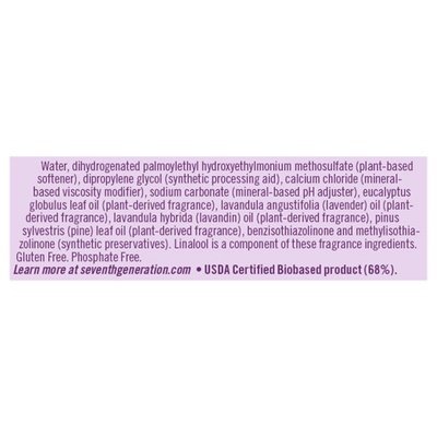 32 loads. Gluten Free. Softens fabric & reduces static. 0% synthetic fragrances; dyes. For standard and HE machines. A clean you can trust. Join us in nurturing health of the next seven generations. Scent made from 100% essential oils & botanica extracts. Hypoallergenic formula. Phosphate free. www.seventhgeneration.com. how2recycle.info. Learn more at seventhgeneration.com. This bottle is made from 100% post-consumer recycled plastic (excluding colorant). USDA Certified Biobased Product: Product 84%. Not tested on animals. No animal ingredients. USDA Certified Biobased product (68%). Made in USA.