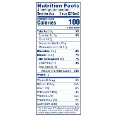 No artificial flavors or colors. 100 calories per serving. Dairy-free. Gluten-free. Soy free. Lactose-free. Egg-free. 50% More calcium than dairy milk (1 Cup of regular dairy milk contains 300 mg calcium vs 1 cup of Almond Breeze contains 450 mg calcium). Almond Breeze 35% DV (450 mg); Dairy milk: 25% DV (300 mg) (1 cup of regular dairy milk contains 300 mg calcium vs 1 cup of Almond Breeze contains 450 mg calcium). Excellent source of vitamin E. Cholesterol-free (Almondmilk, a cholesterol-free food). Non-GMO Project verified. nongmoproject.org. The best almonds make the best almondmilk. Every cup of Almond Breeze is carefully crafted with the best almonds. For over 100 years, our co-op of California family owned orchards has been dedicated to growing the Blue Diamond almonds that give Almond Breeze the delicious, creamy taste you'll love. No artificial flavors or colors. No MSG. Casein-free. Carrageenan-free. All products are produced in a stringent allergen control environment. Blue Diamond Almond Breeze Taste Guarantee: If you are not satisfied with the taste, we guarantee your money back. For specific details, visit almondbreeze.com. almondbreeze.com. how2recycle.info. Scan me for an exciting experience! Facebook: Find us on Facebook. SmartLabel: Scan barcode with SmartLabel app for more information. Questions or Comments? Contact Blue Diamond customer support at 1 (800) 987-2329 or support(at)bdgrowers.com. Please include code number found on pack with all inquiries. almondbreeze.com. To learn more, please visit us at www.bluediamond.com/faqs or scan product UPC code for SmartLabel page. Tetra Pak - Protects what's good. Tetra Brik Aseptic. Please recycle. Rainforest Alliance Certified. FSC: Mix - Board from responsible sources. www.fsc.org. how2recycle.info. How We Make a Difference: California Almond Growers have reduced their water 33% usage by for every 1 lb of almonds grown. Almondmilk produces 78% less carbon emissions than dairy milk. We partner with Project Apis m. to help Honeybees thrive before, during and after the almond bloom. For more information please visit us at www.bluediamond.com/sustainability.