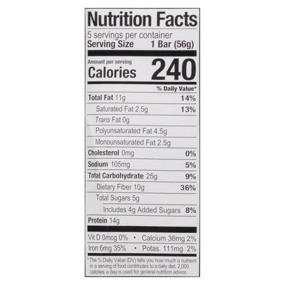 14 g protein. 5 g sugar. 10 g fiber. USDA Organic. Certified Organic by QAI. Gluten-free. Soy-free. Dairy-free. Certified Vegan. Vegan.org.