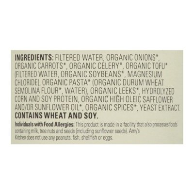 Quality assurance international certified organic. Certified Organic by QAI. Certified vegan. vegan.org. No GMOs. No GMOs - No genetically engineered ingredients. Ready to serve. Do not add water. Amy’s no chicken noodle soup, made with organic noodles and vegetables, is our version of grandma’s soothing soup. It’s tasty, comforting and, of course, contains no chicken. Amy’s kitchen was started when our daughter Amy was born in 1987. We are a family business deeply committed to producing convenient delicious foods made with the highest quality ingredients. amys.com how2recycle.info. We love to heat from you. amys.com. Non-BPA lining.
