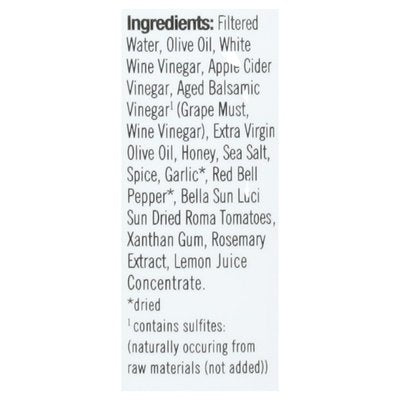 Rich with garlic and sun-dried tomatoes. Italian Kitchen. Your attention please! Remove dressing 20 minutes prior to serving. Olive oil will solidify under refrigeration it might be a slight inconvenience but aren't the best things worth the wait? For three generations our family in Sonoma has shared this delicious dressing around the table. The rich flavor of our estate-grown extra virgin olive oil combines with sun-dried tomatoes and Italian herbs to craft an exceptional vinaigrette. Women owned. www.BellaSunLuci.com. Made in the USA.