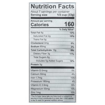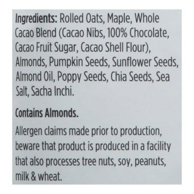 Sweetened with organic maple. 5g protein per serving. High in antioxidants. Non-GMO Project verified. nongmoproject.org. Whole cacao is a leading superfood. Urban cacao. You are eating a granola made of the whole cacao. Whole cacao maximizes the cacao's superfood benefits. Beans (chocolate),shell (GF flour). Fruit (cacao sugar). www.bluestripes.com. info.fairtrade.net/sourcing. nongmoproject.org. Facebook; Instagram(at)bluestripescacao. Certified Fair Trade by FLOCert. UP Cycled Certified. Certified made with Upcycled Cacao Fruit & Cacao Shell Flour. Fairtrade cocoa: Mass balance is used to match Fairtrade sourcing. Visit info.fairtrade.net/sourcing.