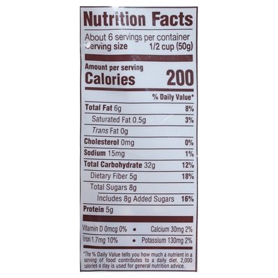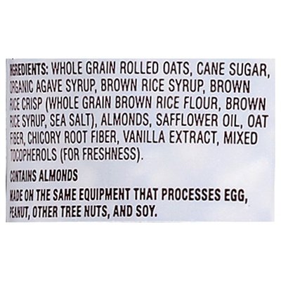 Whole grain rolled oats with almonds. Per Serving: 29 g whole grains; 5 g fiber contains 6 g of total fat. Gluten free. 50% Whole Grain: 29 g or more per serving. 50% or more of the grain is whole grain. wholegrainscouncil.org. Non-GMO Project verified. nongmoproject.org. Since 1960. Since 1960, Back to Nature has been creating great tasting food inspired by nature and enjoyed by the whole family. Our line of plant based snacks feature high quality ingredients like seeds, nuts, whole grains and wheat or gluten-free flour as the base of our delicious products. We carefully select each ingredient and never use high fructose corn syrup or hydrogenated oils. Other than real honey, in our plant based snacks we avoid any ingredients sourced from animals. Vanilla extract and flecks of almonds add delicate taste and hearty crunch to our classic whole grain oats granola. Sweetened with agave and cane sugar, our granola is a delicious reason to smile. This package is sold by weight, not by volume. Some settling of contents may have occurred during shipping and handling. www.backtonaturefoods.com. To Learn More About Back to Nature: Visit us and send us your feedback at Facebook /backtonature. Instagram (at)back2naturefood. Questions or comments? Call 1-855-346-2225 or visit www.backtonaturefoods.com. Also try our cookies, crackers, granola and nuts. You can smile knowing that delicious goodness makes a difference. To Nature Conservancy: Back to Nature is proud to support The Nature Conservancy. Join us to help regreen the planet. To learn more, visit backtonaturefoods.com.