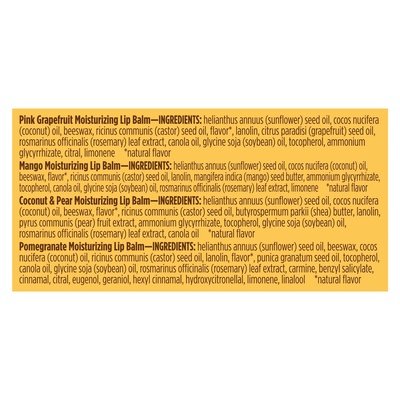 Pink grapefruit. Mango. Coconut & pear. Pomegranate. Formulated without parabens, phthalates, petrolatum or SLS. burtsbees.com/values. Recyclable carton. Pink Grapefruit Moisturizing Lip Balm/Mango Moisturizing Lip Balm/Coconut & Pear Moisturizing Lip Balm/Pomegranate Moisturizing Lip Balm: Cruelty free. Made in USA of global ingredients.