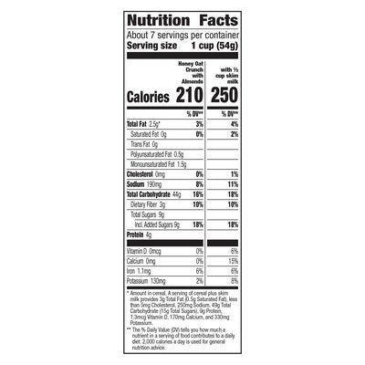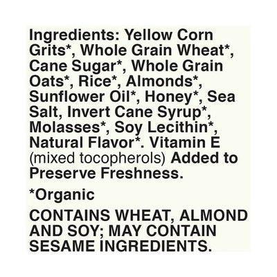 Buzz crunch honey almond. 17 g whole grain per serving. At least 48 g recommended daily. 3g fiber per serving. 3 g fiber per serving. USDA Organic. Oregon Tilth Certified Organic. Non-GMO Project verified. nongmoproject.org. Founded in Skagit Valley, WA. The Farmland: Join us in restoring 25 million sq ft. Cascading Change with The Nature Conservancy. As one of the earliest pioneers of organic agriculture, we have spent more than 40 years working to protect our planet through actions like planting pollinator habitats, helping farmers build healthy soil, and integrating climate-smart crops into our products. But there is much more work to be done. Step-by-step, we are reimagining the relationship between food, farmland, nature & communities, seeking to drive and inspire meaningful change along the way. This package is sold by weight, not by volume. You can be assured of proper weight even though some settling of contents normally occurs during shipment and handling. www.CascadianFarm.com. how2recycle.info. We welcome your questions or comments 1-800-624-4123. Visit us at www.CascadianFarm.com. Box Tops for Education: Download the app. Scan your receipt. Earn cash for schools. Creating a wave of Cascading Change. Our mission is to create Cascading Change to help protect our planet - because small steps can lead to great impact. Our journey has taken us to the critical foodshed of the Sacramento Valley, CA. We're partnering with The Nature Conservancy to protect natural resources like wildlife habitat and groundwater to help farms become more resilient. After all, farms encompass more than just the land at our feet - they include a rich ecosystem above and below ground. By choosing Cascadian Farm, you show support for our commitments to projects like these - in this case, our donation of $750,000 to help build resilience across more than 600 acres, 1 sq ft at a time. Join us in Cascading Change. Learn more at cascadianfarm.com. Cascadian Farm is committing $750,000 to our partners at The Nature Conservancy whose mission is to protect the lands and waters on which all life depends (www.nature.org). Over the course of 12/2020-12/2022, our contribution will help rebuild wildlife habitat and regenerate groundwater on over 600 acres of farmland in the Sacramento Valley, CA. The goal is to restore health to the farm ecosystem, in turn making farming operations more resilient to threats like climate change. Donation to the conservancy not contingent upon purchase. Certified 100% recycled paperboard.