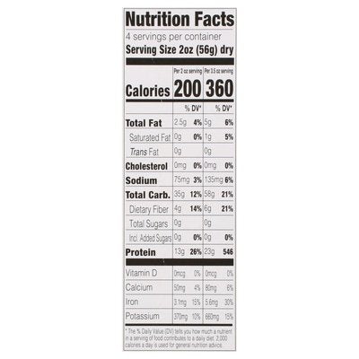 23 g protein. 3.5 oz serving. Compare 3.5 oz/100 g servings: Protein; Explore Cuisine Chickpeas: 23 g; Average Wheat Based Pasta: 13 g. Compare 3.5 oz/100 g servings: Dietary Fiber; Explore Cuisine Chickpea: 6 g; Average Wheat Based Pasta: 3 g. Compare 3.5 oz/100 g servings: Net Carbs (Net carbs = total carbohydrates - fiber); Explore Cuisine Chickpea: 52 g; Average Wheat Based Pasta: 71 g. Certified gluten free. gfco.org. USDA Organic. Production certified organic by EcoGruppo IT BIO 008. Vegan. Non-GMO Project verified. nongmoproject.org. A smarter way to pasta. Plant-based protein. Explore Cuisine searches the globe. To bring you healthy foods! We love to explore and discover innovative, organic foods that are delicious, simple to prepare, colorful and bring plant-based goodness to all. www.explorecuisine.com. Share youre recipe with us (hashtag)Explorerecipes. Facebook: facebook/explorecuisine. Instagram: instagram/explorecuisine. We believe that healthy foods grow from healthy hands, hearts and lives. So we are committed to trading fairly and organic farming. Through our Food to Thrive Foundation we provide education and empowerment to communities in the developing world to farm sustainably and to prosper. 2% of proceeds support the Food to Thrive Foundation. For more info, please see foodthrivefoundation.org. Made in Italy.