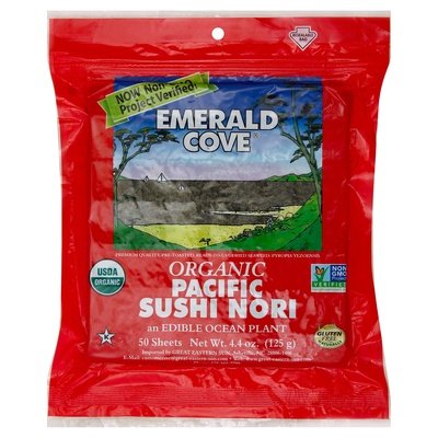 Premium quality, pre-toasted, ready-to-use dried seaweed/Pyropia Yezoensis. An edible ocean plant. Resealable bag. Now Non-GMO Project verified! USDA organic. Non GMO Project verified. nongmoproject.org. Gluten free. Naturally. Web: www.great-eastern-sun.com. Of the scores of kinds of seaweeds consumed around the world, nori is the overwhelming favorite. Although originally gathered wild, nori has been cultivated in Japan since the 1700's, and today more than 300,000 tons of fresh nori are harvested annually from farms in coastal Japan, Korea and North China. Nets of woven rope are suspended below the surface of the ocean in quiet bays, and, during the cold months of winter, the nori slowly grows to cover the entire net. From December to February, the nori is hand-harvested, washed, and placed in frames to dry into paper-like sheets. This low-temperature, slow drying is essential to retain the nutrients. Emerald Cove Organic Pacific Sushi Nori is guaranteed Silver Grade, the highest grade for everyday use in Japan and the highest grade available in the North American natural food industry. The fine texture and pliable sheets produce exceptionally smooth and delicious rolls of nori-maki sushi. Each sheet is pre-toasted to a beautiful, brilliant golden-green. You'll marvel at the clean, sweet taste of this king of edible sea vegetables. Certified Kosher by Star-K Kosher Certification Agency. Nori is naturally gluten-free. Verified non-GMO by The Non-GMO Project. Certified organic by Quality Assurance International. Nori is a fat-free food. Nori is a sodium-free food. Product of China.