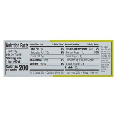 Naturally flavored protein bar. 20 g plant protein. 1 g sugar. 6 g net carbs (27 g carbs - 14 g fiber - 7 g sugar alcohol = 6 g net carbs). Gluten free. Vegan. Soy free. Dairy free. Certified gluten free. gfco.org. Keto friendly. Non-GMO. Non-GMO Project verified. nongmoproject.org. nocow.com. Win free stuff! Scan. Follow the revolution (at)nocow.