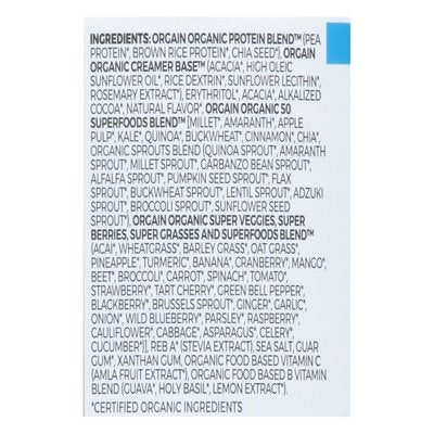 10 g prebiotic + fiber (per serving). 21 g plant protein (per serving). 1 g sugar (per serving). Total Net Carbs: 19 g total carbs - 9 g dietary fiber - 5 g erythritol = 4 g net carbs. USDA Organic. Certified Organic: Quality Assurance International. Certified plant based. Vegan. Gluten free. High Standards: Vegan. No soy ingredients. Gluten free. Non GMO. No soy ingredients. Plant-based protein. Non-GMO. If it's organic it's non GMO. Plant-based protein. 50 superfoods. Our Commitment to Clean Nutrition: Orgain's relentless pursuit of better nutrition that doesn't compromise on taste is based on my belief that real foods can make a real difference. That passion fuels our mission to help people live vibrant lives through good, clean nutrition. In good health, Andrew Abraham, M.D. Founder, Cancer Survivor & Food Entrepreneur. Good, clean nutrition. Higher standards. Certified plant based. Protein that puts on a superhero cape. Your favorite organic plant-based protein powder is bringing more than 50 superfood friends to your daily nutrition party, including organic pea, chia, kale, flax, quinoa, beet, turmeric, and more. It's perfect when you wanna shake things up, bake things up, or just have some good, clean fun. orgain.com. Facebook. Instagram. Pinterest. Orgain.com. See website for product details. Questions about Orgain products? 888-881-GAIN (4246).