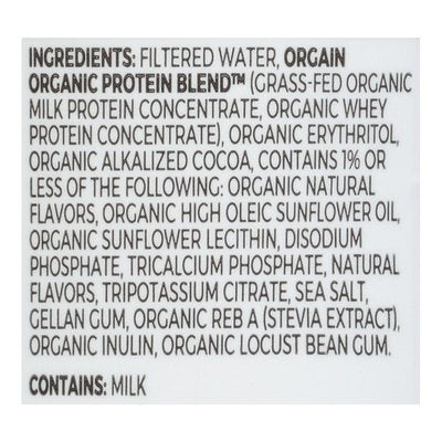No artificial flavors. 26 g grass-fed protein. 1 g sugar. No soy ingredients. Gluten free. USDA Organic. Certified Organic: If it's organic it's non GMO. Certified Organic by QAI. No artificial preservatives. Non-GMO. Certified Organic. Grass-fed milk protein. Higher Standards: No artificial sweeteners. Carrageenan free. orgain.com. Facebook. Instagram. Pinterest. Orgain.com. See website for product details. Questions about Orgain products? 888-881-Gain (4246).